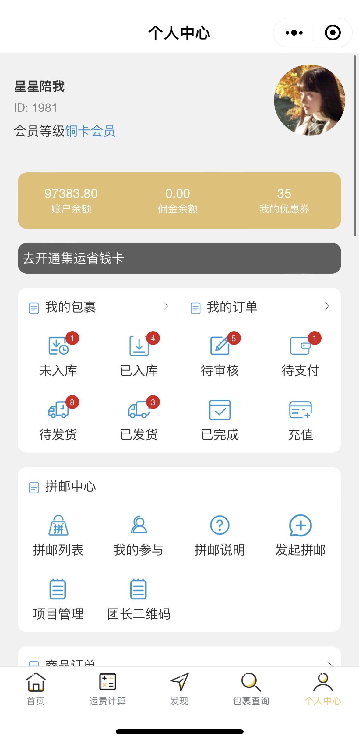 嗨轉寶集運小程序功能截圖